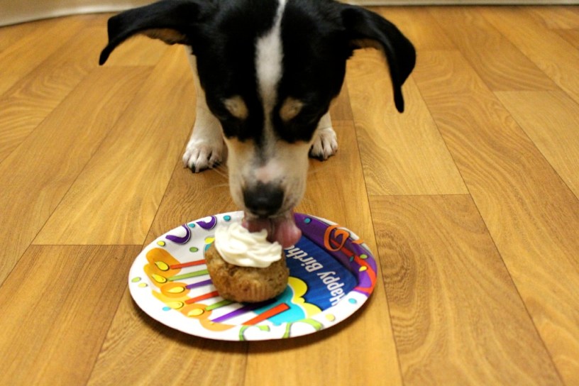 It’s Jack’s birthday! My little puppy dog is turning two today (February 12). For his special day, in addition to a couple new toys, I made him these cupcakes! He was so happy he got his own cupcake to eat with the rest of us for once! This recipe makes about 4 (and a half) cupcakes. I actually had to make these twice. First I tried making them using a recipe I found and well that did not go well. The second time I changed the ingredients around and the quantities to create this. This one is much better. One note to add is that I used the peanut butter that is made for dogs specifically. To me it seems a lot more oily than normal peanut butter. If you do use human peanut butter, you may need to add a couple teaspoons of oil.