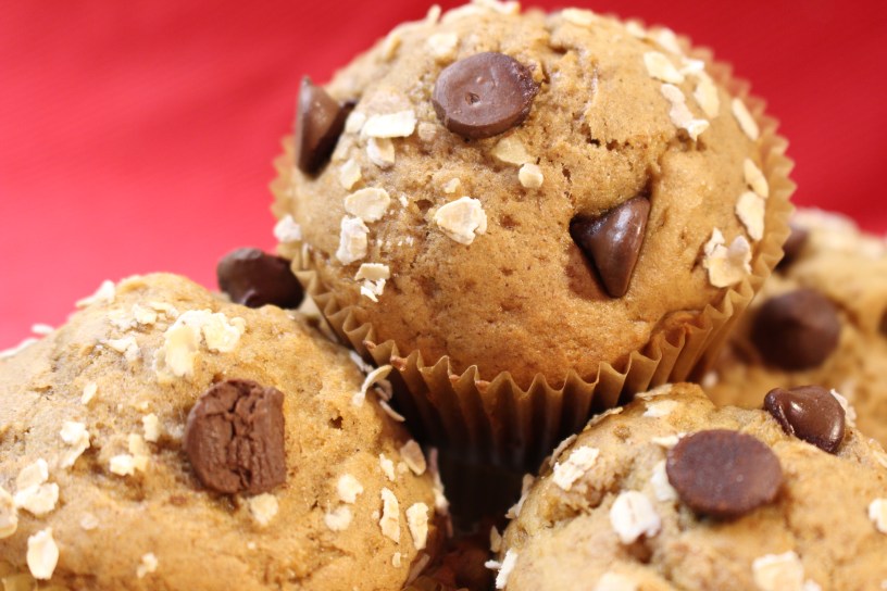 4. Scoop the batter into the muffin pan filling each cup about 1/2 way. The batter might seem a little thick but that is normal! Sprinkle the tops of the muffins with oats and add a few chocolate chips.