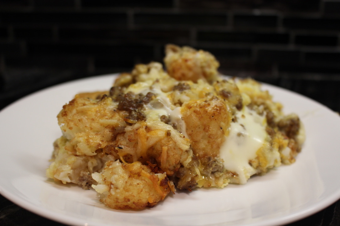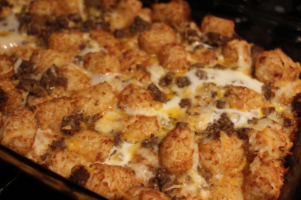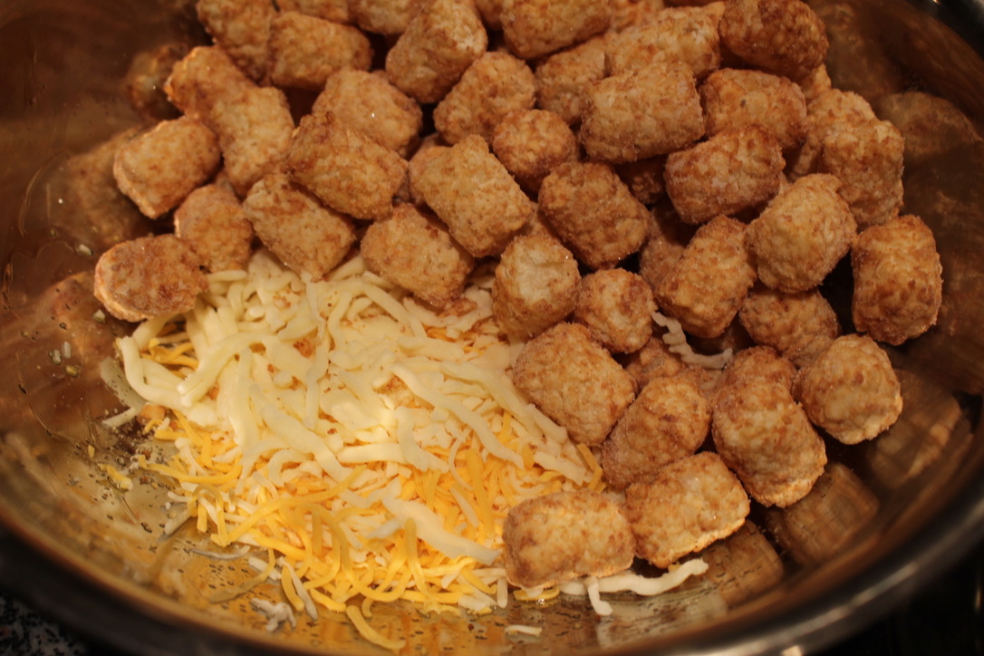 - In a large bowl, combine the frozen tater tots, cooked sausage, and cheese.